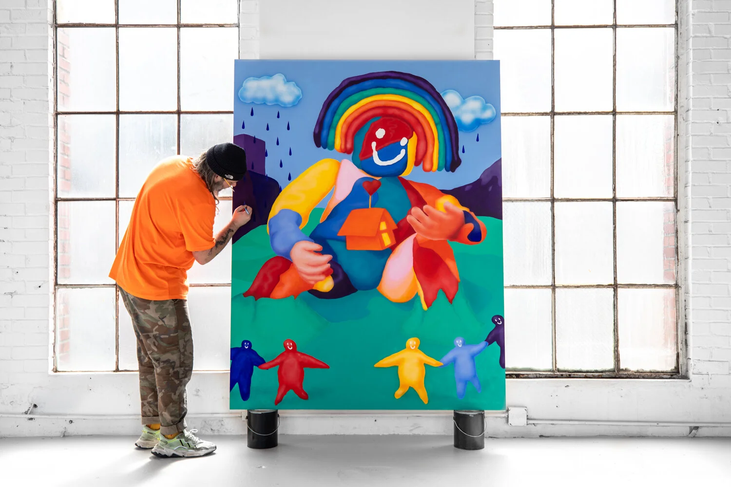 Gage Hamilton, a fine artist and muralist living in Portland, Oregon, seeks to capture the detachment of the modern human experience. Voids, walls, ropes and drops figure prominently in his work, as do themes of falling, restraint and letting go. In the series B.Y.E., Hamilton responds to a year of collective spiritual death with a vibrant, joyful absurdism, representing the cognitive dissonance of the current American psyche and an embrace of positive nihilism.